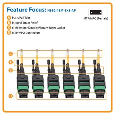 The N392-45M-3X8-AP’s slim, space-saving design occupies minimal space in your installation. Its 8-fiber MTP/MPO connectors are almost identical in size to SC connectors but are 12 times denser, freeing up circuit card and rack space for other cables. Its APC connectors are also angled, preventing infrared light that enters the fiber from bouncing back into the laser. All of this cable’s connectors have been tested for low insertion loss and back reflection. Attenuation loss meets or exceeds current standards.