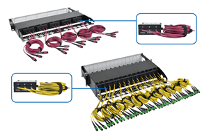 Each cassette has three built-in MTP cables, providing a plug-and-play solution that’s ready for immediate deployment. The MTP cables have Base-8 connectivity (eight fibers) for full fiber utilization in a 40 Gb network. Because the cables are hardwired into each cassette, there is a lower level of insertion loss compared to plugging separate cables into MTP ports. The MTP cables are two meters long to reduce cable congestion in the rack. Versions are available for OM4 multimode and singlemode fiber.