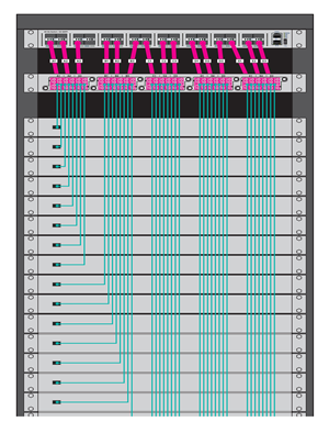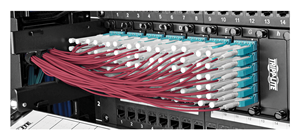 Tripp Lite breakout fiber patch panels are pre-populated with multiple modular breakout cassettes. The back of each cassette has three hardwired 8-fiber MTP cables. The MTP cables connect to the QSFP+ transceivers on a 40 Gb switch. The front of each cassette has duplex LC ports for connection to the SFP+ ports on 10 Gb equipment. There’s no need for custom cables; you can make the 10 Gb connections with high-quality duplex LC cables that are readily available.