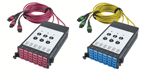 Each cassette has three built-in MTP cables, providing a plug-and-play solution that’s ready for immediate deployment. The MTP cables have Base-8 connectivity (eight fibers) for full fiber utilization in a 40 Gb network. Because the cables are hardwired into each cassette, there is a lower level of insertion loss compared to plugging separate cables into MTP ports. The MTP cables are two meters long to reduce cable congestion in the rack. Versions are available for OM4 multimode and singlemode fiber.