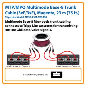Tripp Lite’s N858-23M-3X8-MG is recommended for high-density connections between network equipment in telecommunication rooms and data centers. Colored magenta for instant identification as an OM4 cable, this 23-meter (75foot) cable supports 40/100 Gb Ethernet speeds for patching between data center MDFs (main distribution frames) and IDFs (intermediate distribution frames).
