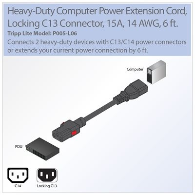 Tripp Lite’s P005-L06 computer power extension cord features 14 AWG wire suitable for high power connections, making it a reliable solution for large server applications that require a higher-rated, heavier-gauge cable. This C14-to-C13 cord can be used to connect a computer, server, monitor or drive to a UPS system or PDU or replace or upgrade the standard power cord provided by the device’s manufacturer. The six-foot length allows you flexibility in placing equipment with respect to the power outlet.