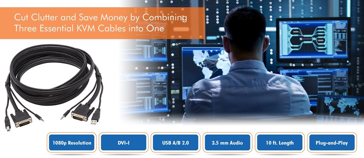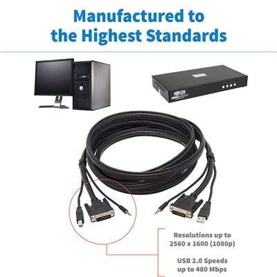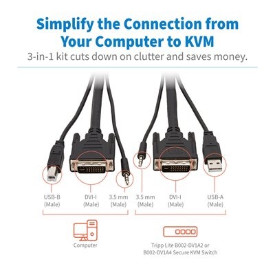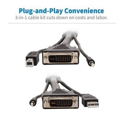 Featuring 24-pin dual-link DVI-I, USB and 3.5 mm audio connectors on both ends, Tripp Lite’s P784-010 connects your computer to a KVM switch in one fell swoop, without requiring different cables. Recommended for Tripp Lite’s B002-DV1A4 KVM switch, this 10 ft. cable cuts down on clutter and saves money by eliminating the need to purchase additional cables.