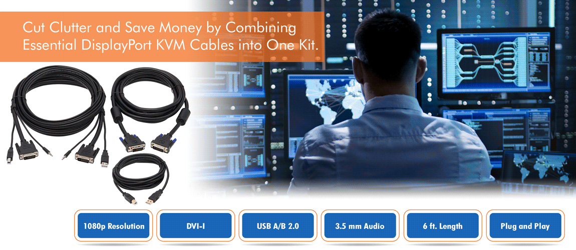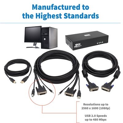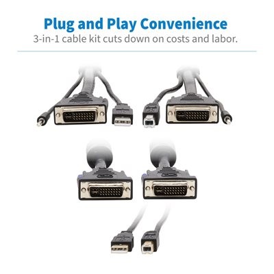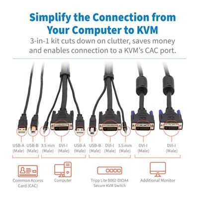 Featuring DVI-I, USB and 3.5 mm audio connectors on both ends, Tripp Lite’s P784-010-DVU connects your DisplayPort computer to a KVM switch in one fell swoop, without requiring different cables. Recommended for Tripp Lite’s B002-DV2AC4 KVM switch, this 10 ft. cable cuts down on clutter and saves money by eliminating the need to purchase additional cables. An included USB A/B cable connects to the KVM’s Common Access Card (CAC) port, allowing you to access smart cards, scanners and biometric readers to bolster security. An included DVI cable connects an additional monitor.