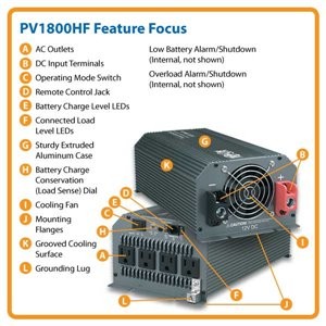 The PV1800HF efficiently converts DC power from a vehicle battery into 120V AC power for any type of equipment, from heavy-duty drills, saws and pumps to computers and sensitive monitoring equipment. The PV1800HF provides safe, stable, AC output power to help connected equipment perform at its peak. A frequency control feature ensures that devices dependent on tightly regulated AC line frequency, such as computers, VCRs and DVD/CD players, receive clean computer-grade power.