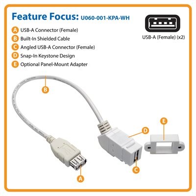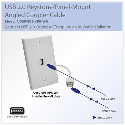Tripp Lite’s USB 2.0 All-in-One Keystone/Panel-Mount Angled Coupler Cable is designed for installation in a keystone wall plate to connect USB cables while minimizing clutter in in-wall cable runs. The U060-001-KPA-WH features a 1-foot USB cable with a USB-A female connector on each end. One of the connectors has a durable plastic housing for snap-in keystone mounting. The built-in cable is attached to the housing at an angle to require less clearance, which is helpful in tight installations.