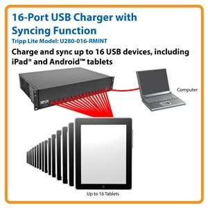 For today’s battery-intensive mobile devices, a standard USB hub is not sufficient for charging. Tripp Lite's U280-016-RMINT 16-Port USB Charging Station with Syncing allows you to sync and charge up to 16 tablets, phones, or other mobile devices—all at the same time! Up to 5V, 2.4A (12 Watts) of charging power is provided to each port, making it an ideal charging solution for even the most power hungry devices like the iPad