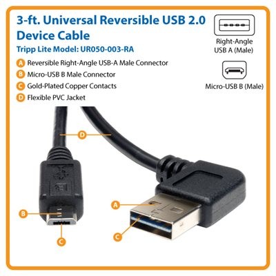 The UR050-003-RA is constructed of top-quality materials. For optimal connectivity, this reversible cable has nickel-plated connectors with gold-plated copper contacts. It’s double-shielded with foil and braid to ensure maximum EMI/RFI protection and signal quality. The cable’s molded connectors with integral strain-relief guarantee durability and long life. An angled connector and a flexible PVC jacket make the UR050-003-RA easy to install in tight spaces.