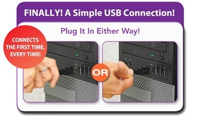An angled connector makes installations easy in hard-to-reach spaces behind peripherals. When plugged in, the angled connector guides the cable parallel to your device, taking up less space, allowing your device to be closer to walls, and reducing strain on the cable. And, unlike a traditional USB connector that can be attached only one way, a reversible connector plugs into a USB port in either direction, making the connection the first time, every time.