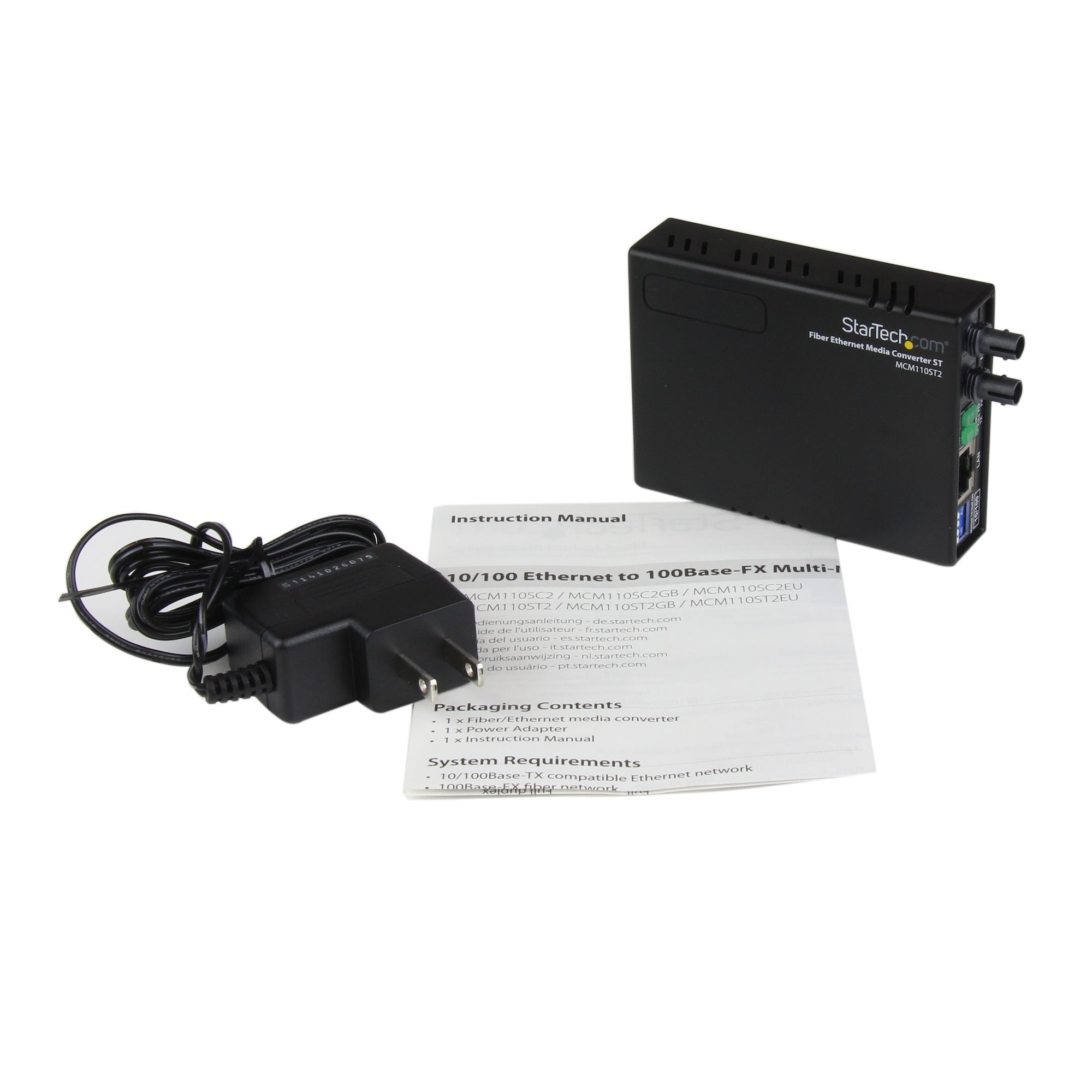 The MCM110ST2 10/100 Multi Mode ST Fiber Ethernet Media Converter (2 km) creates a cost-effective Ethernet to fiber link, transparently converting to/from 10Base-T or 100Base-Tx Ethernet signals and 100Base-Fx optical signals to extend an Ethernet network connection over a multimode fiber backbone.