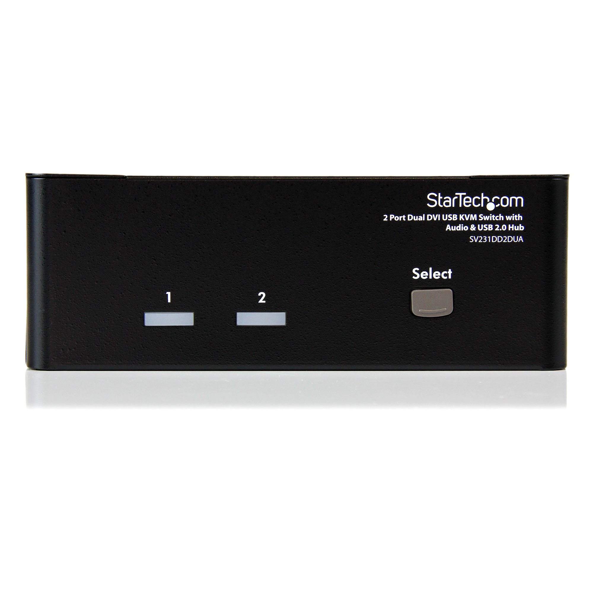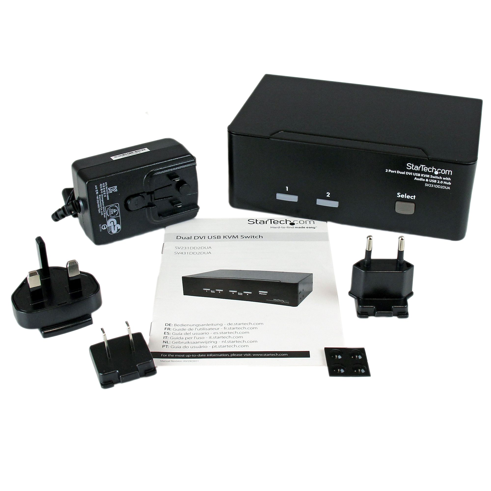 The SV231DD2DUA 2-port Dual DVI USB KVM Switch allows two PCs, each with dual DVI video outputs, to share two monitors, one microphone and set of speakers, one keyboard and one mouse as well as two other USB peripherals.
