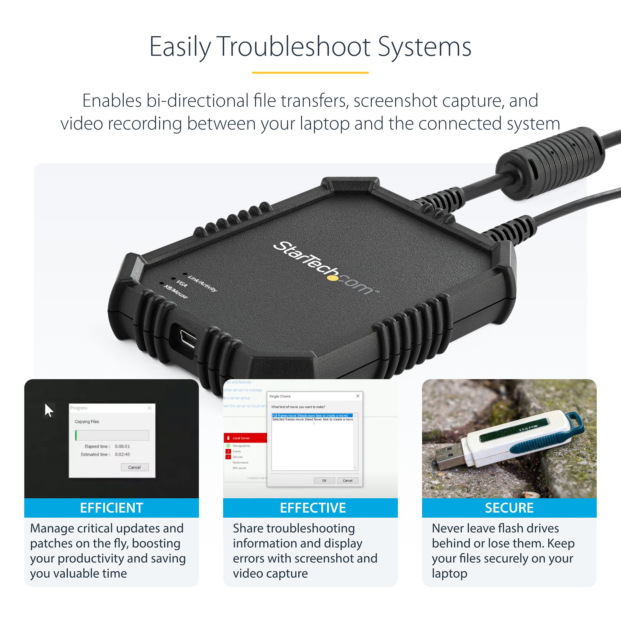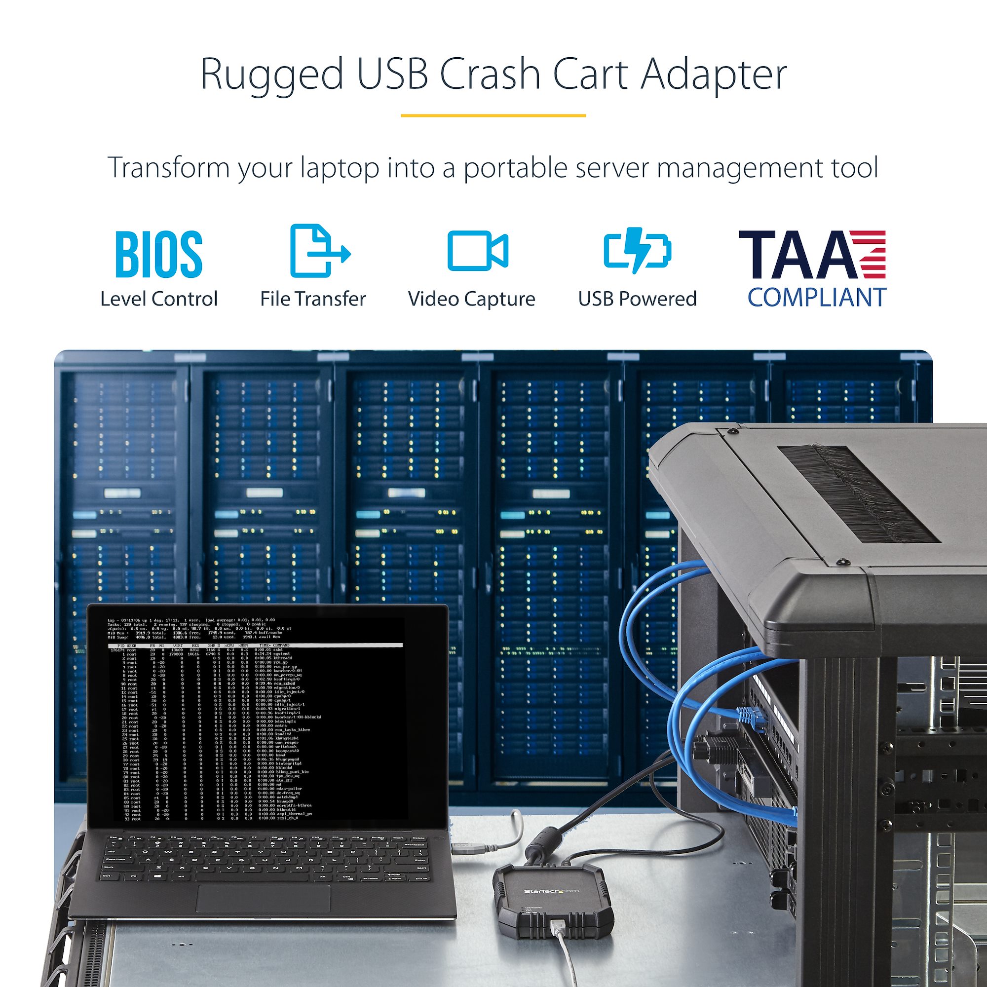 This rugged and portable USB crash cart adapter lets you turn your laptop into a portable console for accessing servers, desktops and laptops, as well as ATMs, kiosks or any computing device that features both VGA and USB ports.