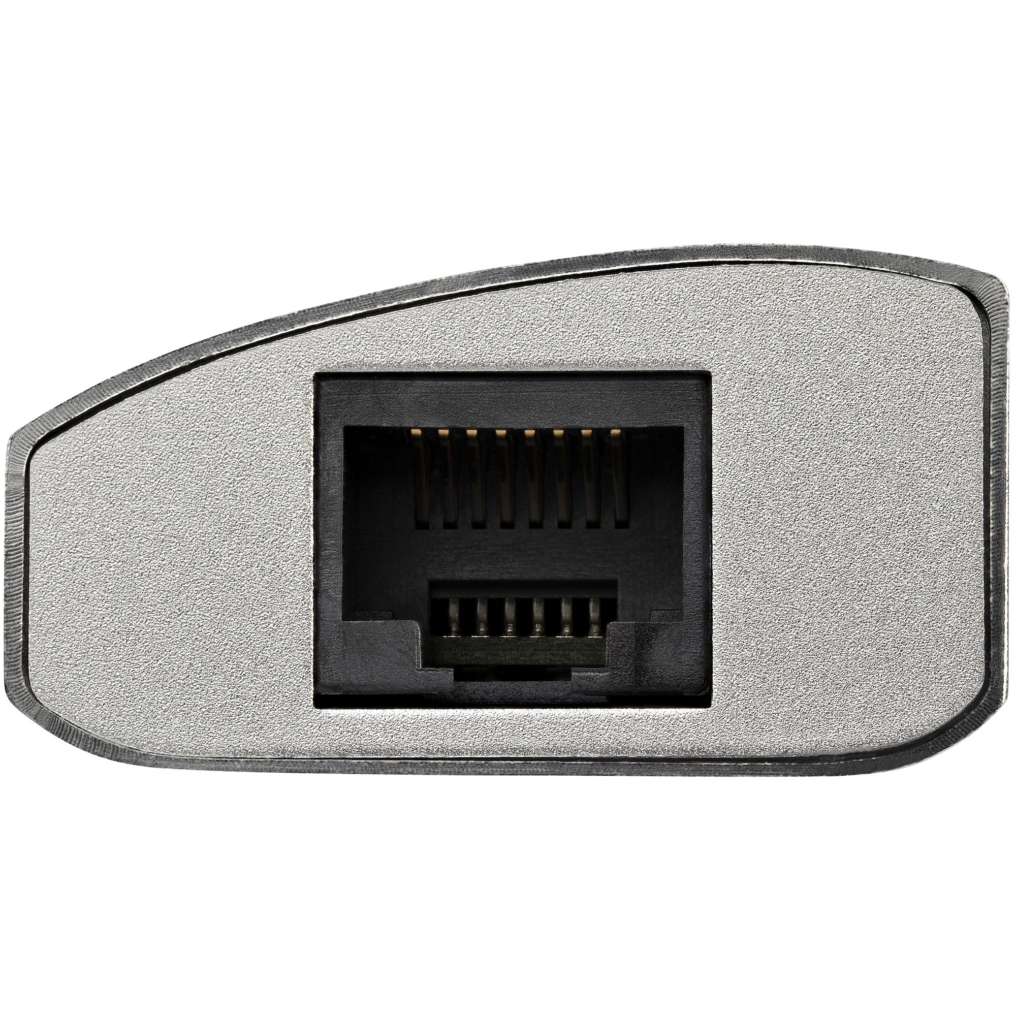 The USB hub features a Gigabit Ethernet adapter. The Ethernet controller is compatible with the IEEE 802.3u/ab standards and supports Wake-on-LAN (WoL), Jumbo Frames, and V-LAN Tagging. The network adapter enhances laptop network reliability, security, and performance, by utilizing wired 10/100/1000Mbps Ethernet.