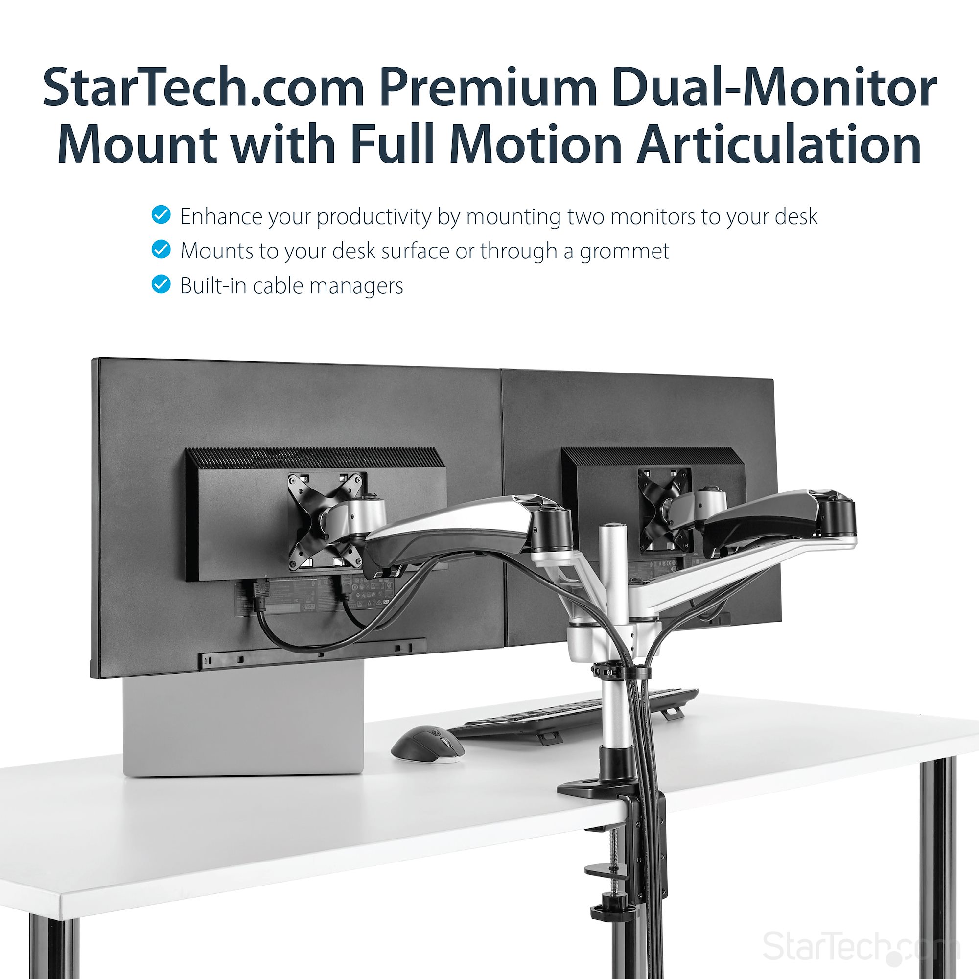 Create a dual-monitor setup to suit your needs, using the interchangeable arms with quick-connect assembly.