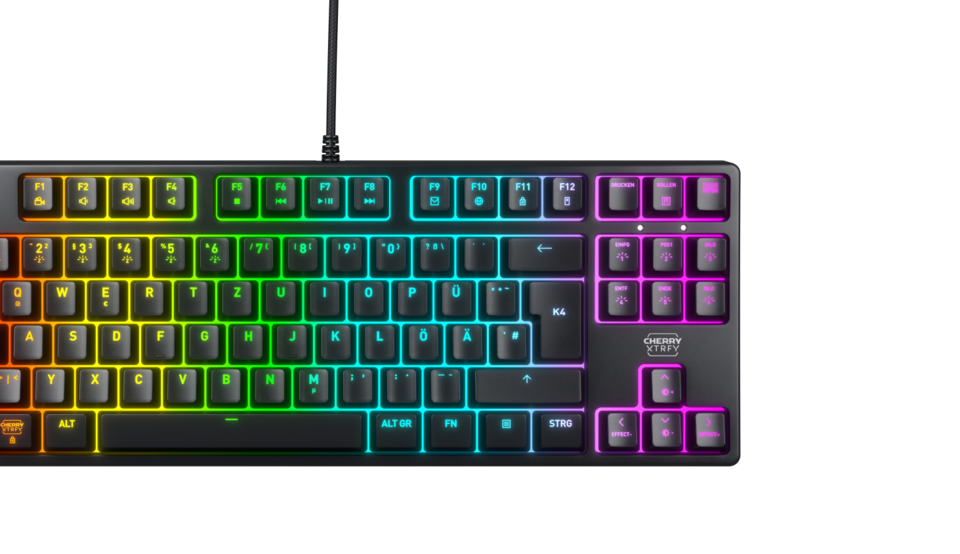 Let your setup shine according to your own taste: The CHERRY XTRFY K4V2 TKL gaming keyboard features impressive RGB lighting that lets you adjust the colors in a total of six zones of the keyboard. You can choose from a wide range of background lighting and typing effects and easily adjust them without needing any software.