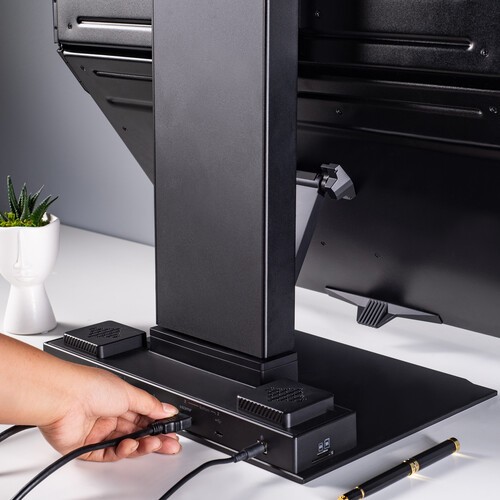 Adjust the height of the top display and the bottom display will pivot in or out accordingly making for a better user experience and more options when it comes to matching your eye level and desk space.