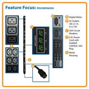 The PDU3MV6H50 provides reliable 208V power service via 45 outlets in three separately breakered 20A single-phase load banks: 36 C13 outlets (12 per phase, 12 per breakered 20A load bank) and 9 C19 outlets (3 per phase, 3 per breakered 20A load bank). This PDU has a rugged all-metal housing and a 6 ft. power cord with a Hubbell CS8365C 50A twist-lock plug. Load capacity is 12.6kW.
