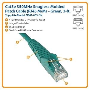 Manufactured from 4-pair stranded UTP, the N001-003-GN provides high-speed connection and flawless signal delivery. This cable can deliver speeds up to 350 MHz/1 Gbps. Featuring a PVC jacket, this three-foot Tripp Lite Cat5e 350MHz Snagless Molded Patch Cable is constructed of top-quality materials for long life and durability. Its RJ45 (male) connectors are gold-plated to ensure an accurate signal transfer. For a secure connection, the cable is molded with integral strain-relief and has a snagless design that protects the locking tabs on the RJ45 connectors from being damaged or snapped off during installation. The N001-003-GN meets the most current industry standards, including IEEE 802.3ab, IEEE 802.5, ANSI/EIA/TIA 568, ISO/IEC 11801 and ETL (category 5e draft 11).