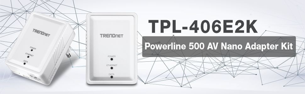 TRENDnet's Powerline 500 AV Nano Adapter Kit, model TPL-406E2K, uses an electrical outlet to create a high speed network. Two adapters are needed to start a network. Connect one adapter to your router and plug another adapter into an outlet on your electrical system for instant high-speed network access. The compact form factor saves space around crowded electrical outlets. Use up to 8 adapters to network devices in different rooms without running new cabling.