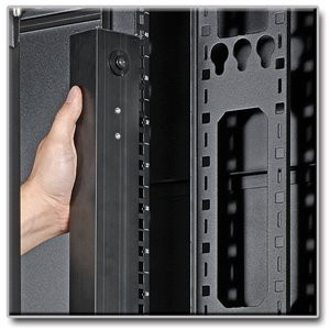 The SR45UBSD’s two adjustable vertical mounting rails support toolless button-mount 0U installation of compatible PDUs and cable managers. Each rail can accommodate two vertical PDUs or cable managers side by side, for a total of four units per enclosure cabinet. These vertical mounting rails make it easier to route power and cabling to installed rack equipment and are ideal for network switches that have side-to-side airflow and forward-facing ports.