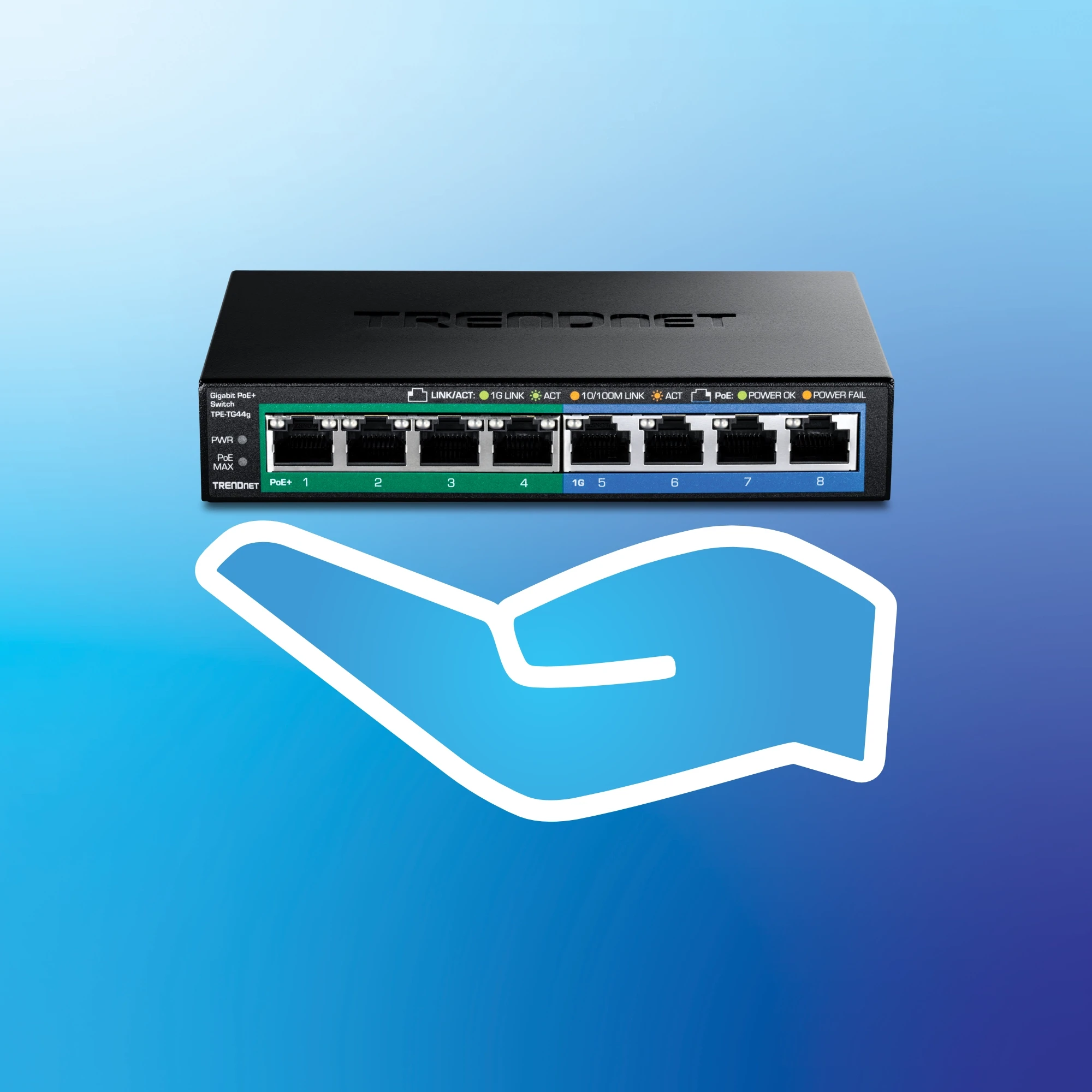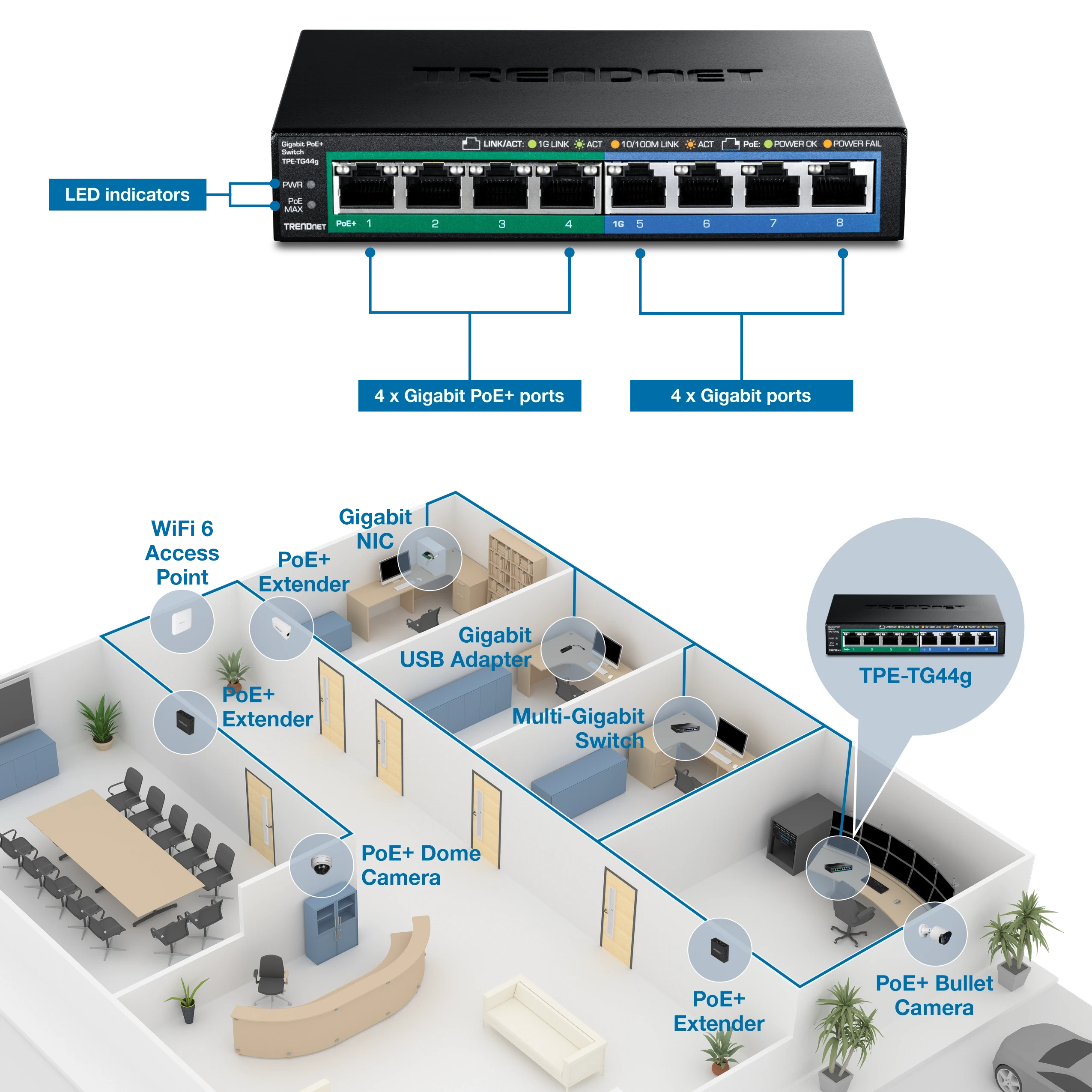 Four gigabit PoE+ ports and four gigabit ports