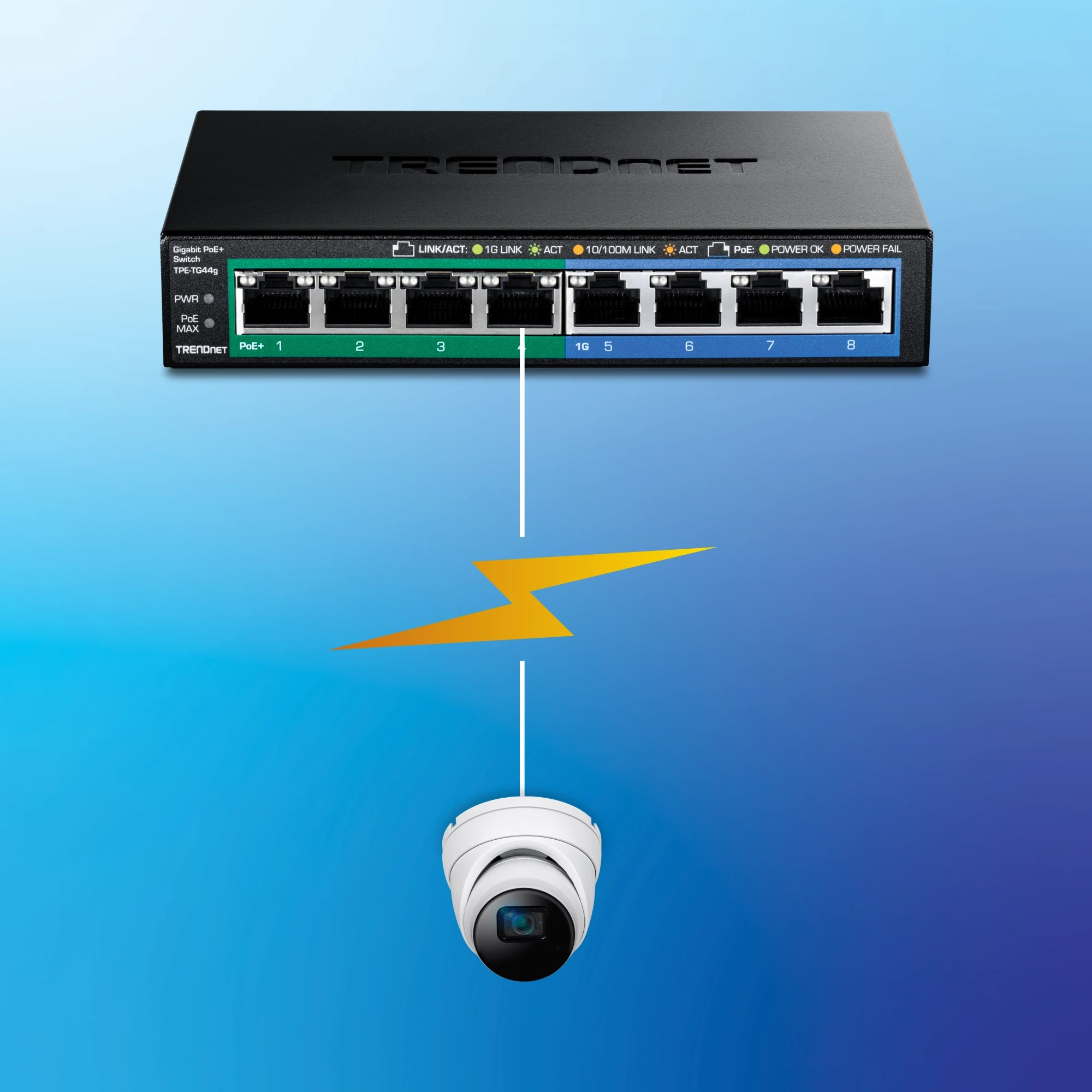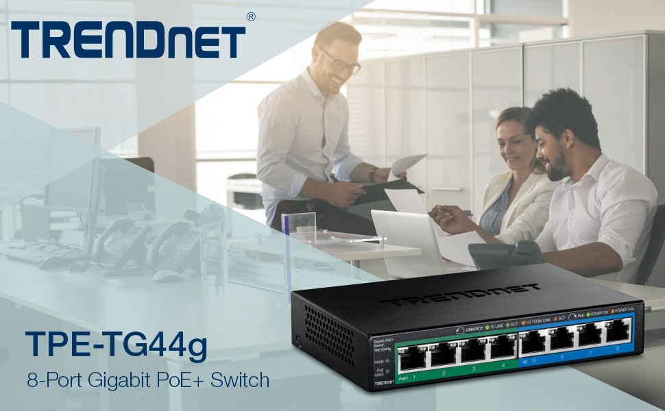 TRENDnet’s 8-Port Gigabit PoE+ Switch, model TPE-TG44g, reduces equipment and installation costs by delivering data and power over existing Ethernet cables. This unmanaged switch offers four Gigabit PoE+ and four Gigabit non-PoE ports. The PoE+ standard supplies up to 30W of power per port for devices, such as wireless access points, PTZ cameras, or VoIP telephony systems.