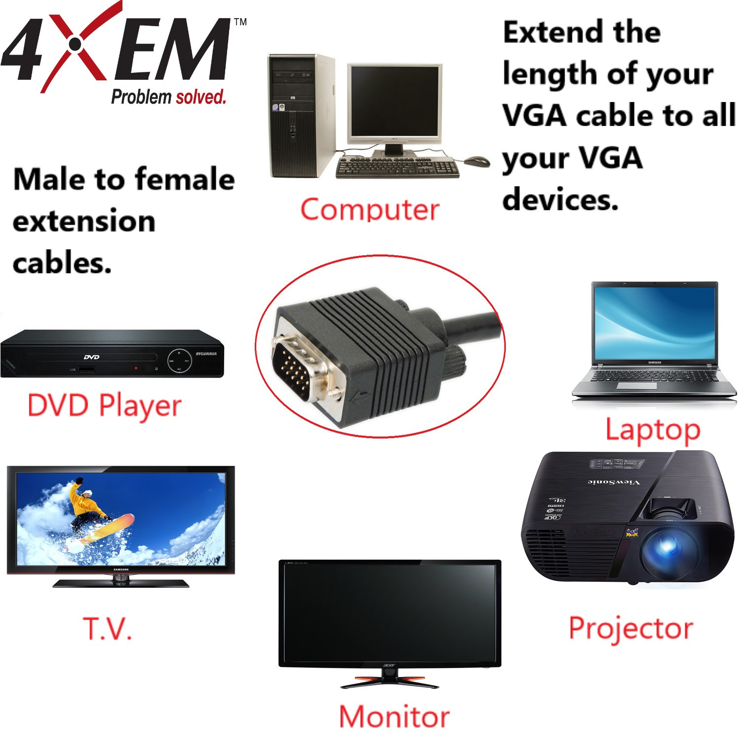 4XEM high quality VGA extension cables allow you to position you monitor or any other VGA device farther away from your computer. Our VGA extension cables are available from 3ft all the way up to 100ft lengths.