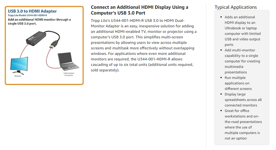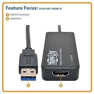 With no external power supply to install, the U344-001-HDMI-R is easy to set up and place conveniently in your application. The bus-powered adapter is ready to go out of the box. Simply install the driver, connect the adapter to your computer’s USB port and connect the additional monitor or projector. The new display will be visible in your computer’s display settings.