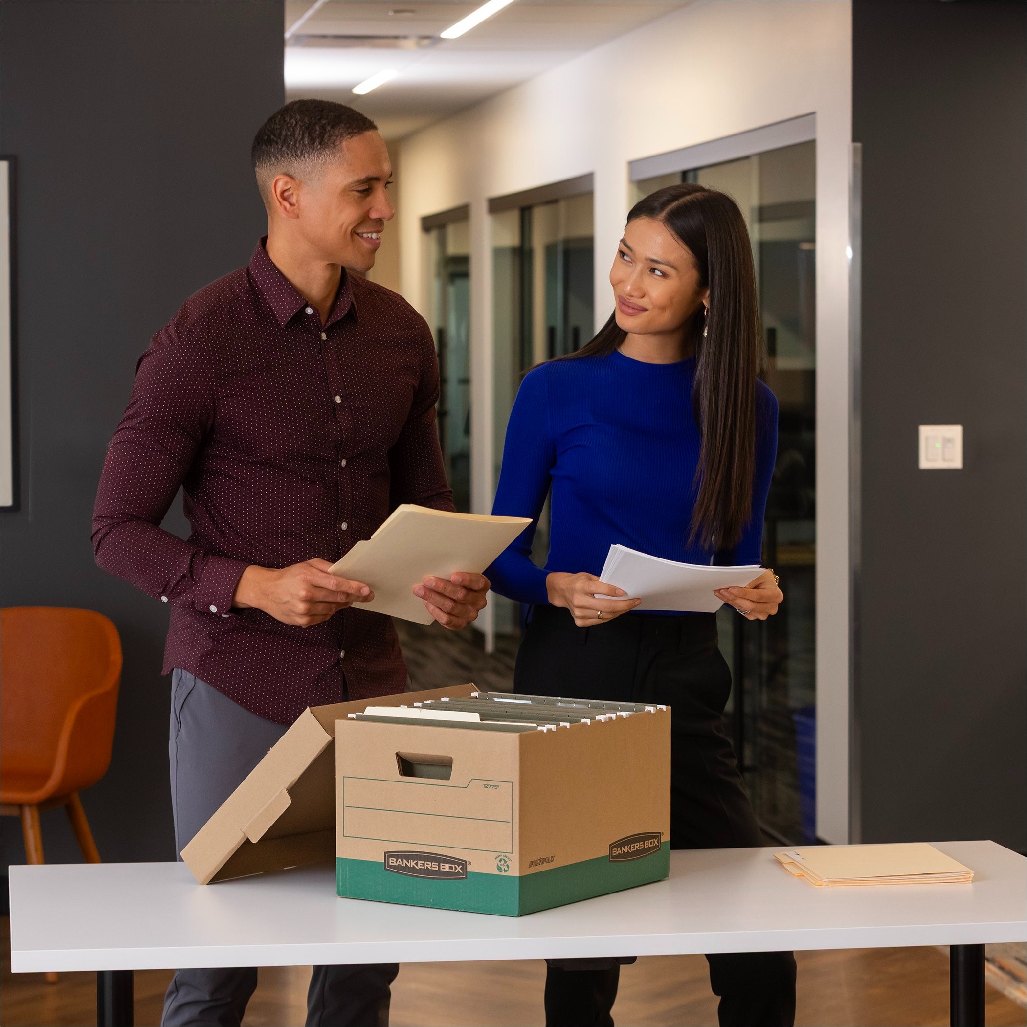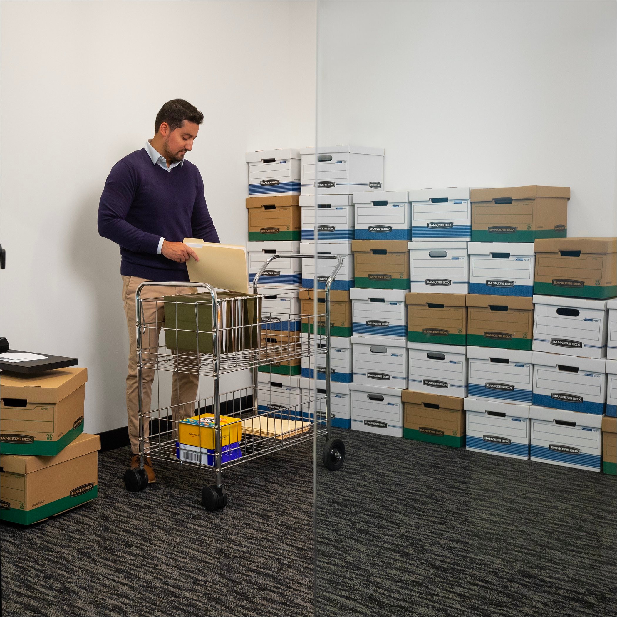 Heavy-duty, triple end, double side, double bottom construction stacks up stronger and withstands frequent handling. FastFold quick and easy assembly. Reinforced tear-resistant handles make Box comfortable to carry. Deep, locking lift-off lid stays in place for secure file storage. Smooth rolled edges add strength and prevent paper cuts. 850lbs. stacking strength. 60% total recycled content.