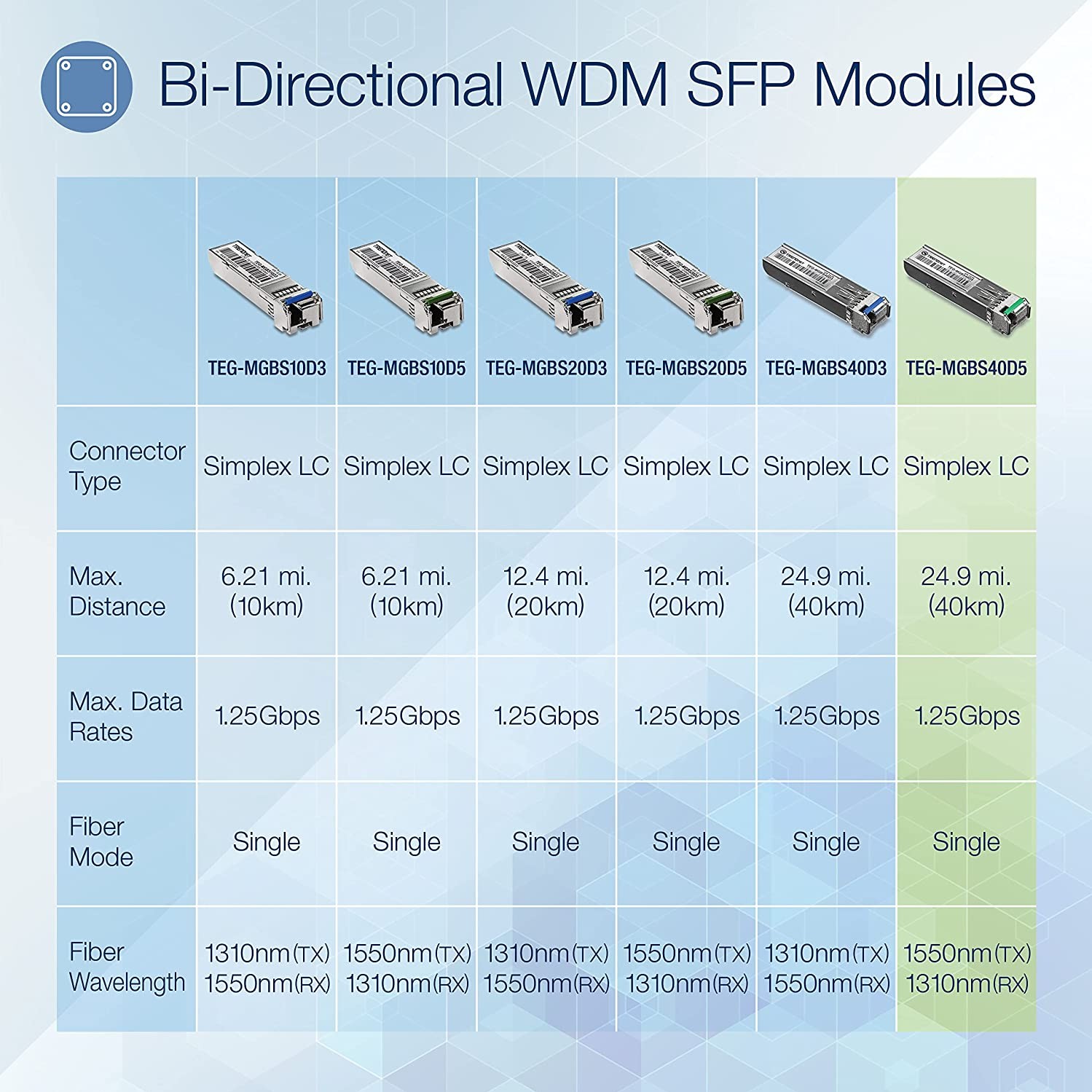 Transmit: 1550nm / Receive: 1310nm, pair with TEG-MGBS40D3 or compatible SFP module