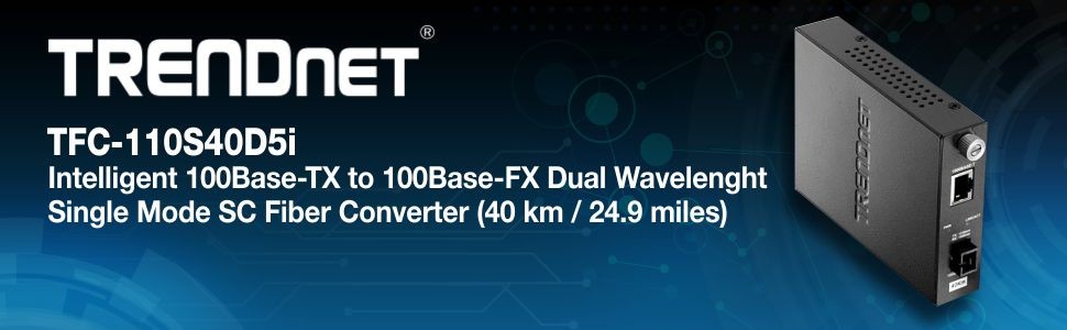 The TFC-110S40D5i intelligent fiber converter works with the TFC-1600 chassis system or as a standalone unit. This converter is a Dual Wavelength Single Mode SC-Type fiber converter that spans distances up to 40 km (24.9 miles). This module must be used with the TFC-110S40D3i module. Ports include 1 x 10/100Base-TX (RJ-45) port and 1 x 100Base-FX (SC Simplex Type) port.
