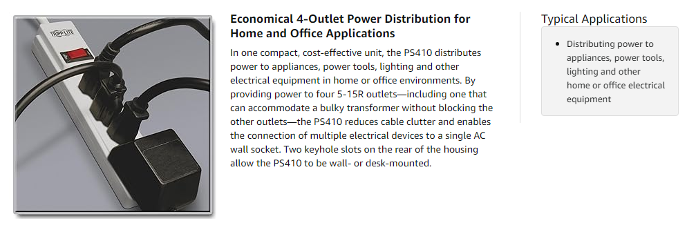 The PS410 is backed by a lifetime warranty. As part of Tripp Lite’s commitment to environmental responsibility, it is manufactured in compliance with strict RoHS specifications.