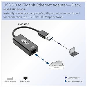Finally – a simple network connection! Tripp Lite’s U336-000-R USB 3.0 to Gigabit Ethernet Adapter instantly connects a computer, laptop, notebook or Chromebook to a Gigabit network through a USB port without requiring the installation of an internal Ethernet card. This compact, USB-powered adapter offers plug-and-play convenience with no external power supply needed. It supports true 10/100/1000 Mbps Ethernet speeds for ultra-fast downloads, and USB 3.0 compatibility allows large data transfers without compromising signal quality. This adapter is the perfect companion for traveling presenters, lecturers, salespeople and anyone needing to connect to a wired network on-the-go. Use it in auditoriums, libraries, hotel lobbies, trade show booths or anywhere a wired connection is available.