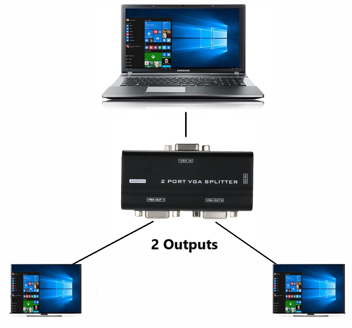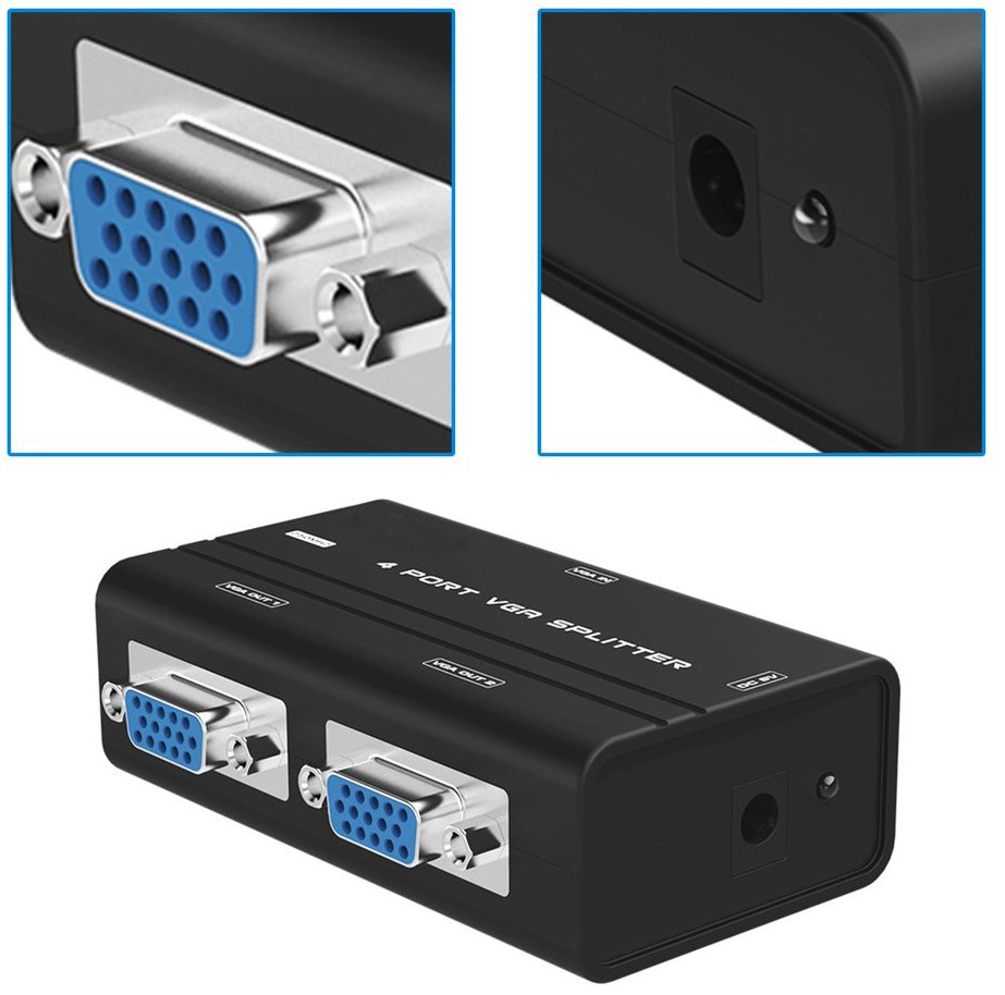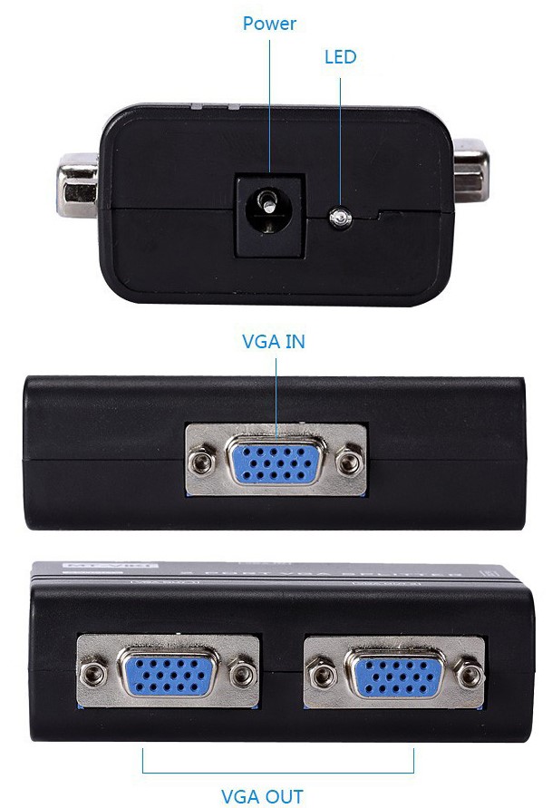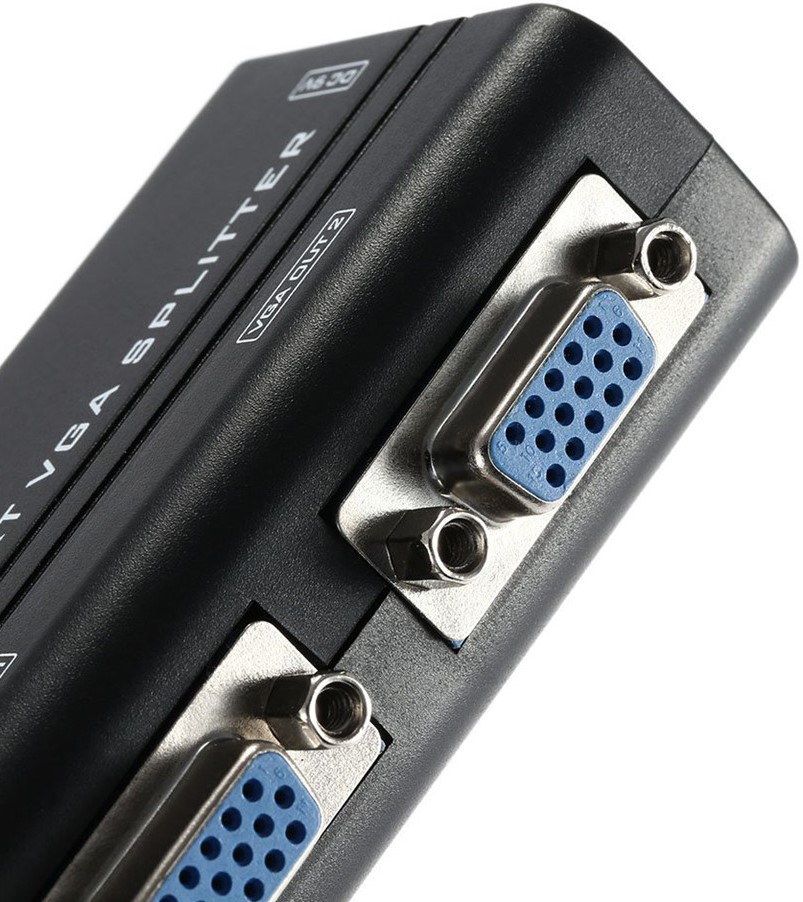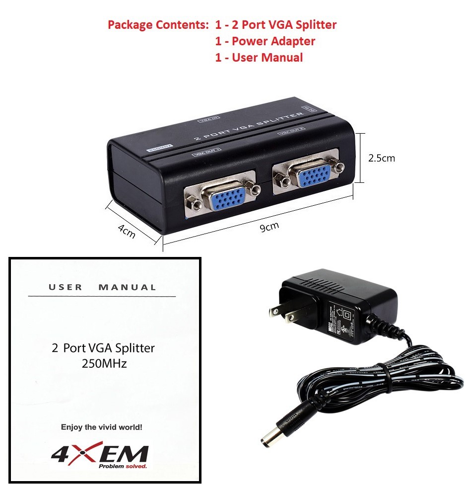 Your new 4XEM 2 port VGA splitter will simultaneously deliver high resolution VGA video from one VGA source to up to two separate monitors. Send the video as far as 213ft away from the source.