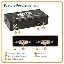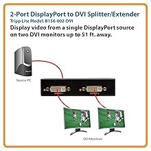 The B156-002-DVI splits a single DisplayPort video signal into two or expands video over both displays up to 51 feet away. Displays can be placed up 35 feet away from the splitter unit and an additional 16 feet away from the video source for standard 1080p (1920 x 1080 @ 60Hz) and 3840 x 1080 @ 60Hz (in extended mode) video.