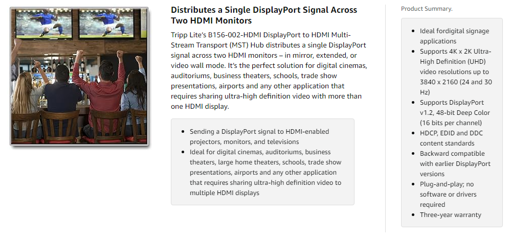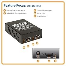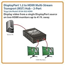 When using the most current protocols, your installation is guaranteed vibrant, rich picture and sound. The B156-002-HDMI is compatible with DisplayPort v1.2, which supports multi-stream transport. This allows you to configure your monitors in three possible ways: in mirror mode, where each monitor displays the exact same thing as the other; in extended mode, which stretches your desktop over both monitors; and in video wall mode, which combines both monitors into one large monitor. This hub also provides better resolutions, higher refresh rates and greater color depth. It is backward compatible with earlier DisplayPort versions and works with Apple Thunderbolt connectors.