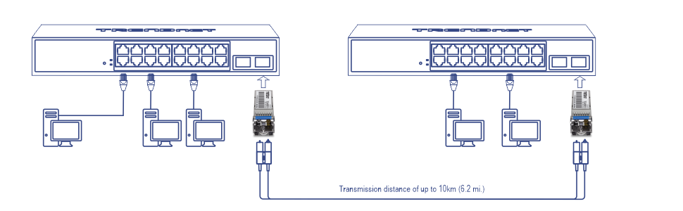 TRENDnet’s SFP Single Mode LC Modules are compatible with standard SFP slots found on network switches and fiber converters. Each single mode SFP transceiver is equipped with a duplex LC fiber connection interface, and supports high-speed data rates up to 1.25Gbps. All TRENDnet SFP fiber modules support connections for reliable, long distance network applications.