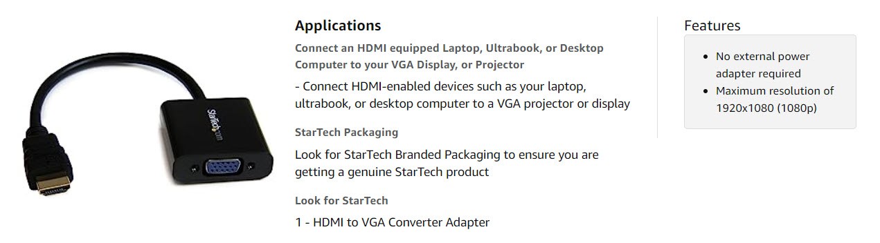 The HD2VGAE2 HDMI to VGA adapter allows you to connect an HDMI output from your laptop, ultrabook, or desktop computer onto a VGA monitor or projector, saving the cost of upgrading to an HDMI compatible display.