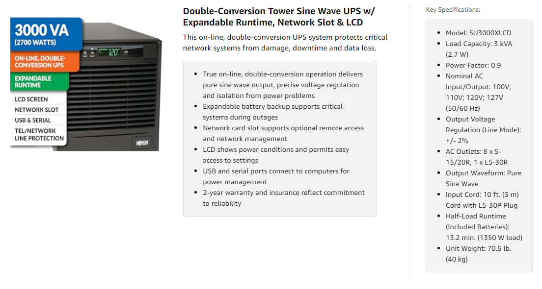 - Half-Load Runtime: This UPS system will support a 50% load (1350W) for up to 13.2 minutes using the included batteries.