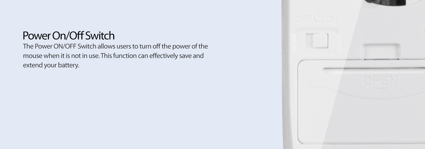 Power On/Off Switch The Power ON/OFF Switch allows users to turn off the power of the mouse when it is not in use. This function can effectively save and extend your battery.