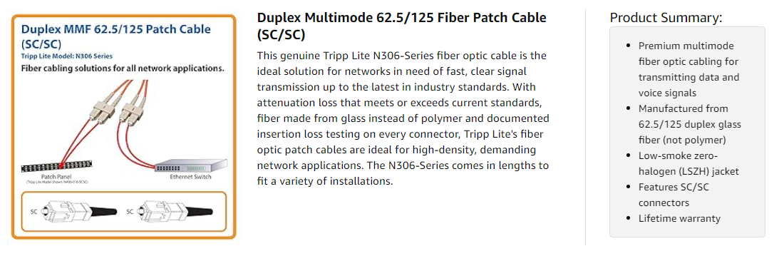 The N306-Series is manufactured using top-quality materials. It has 62.5/125 duplex (zipcord) fiber made from glass instead of a polymer, a low-smoke zero-halogen jacket (LSZH) and sturdy SC connectors. The LSZH jacket limits the amount of toxic smoke emitted in case of combustion and is perfect for poorly ventilated areas. The jacket is orange to distinguish the N306-Series from singlemode cables.