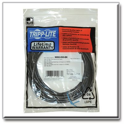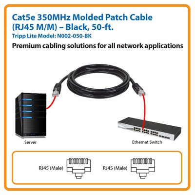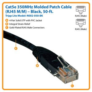 Don’t settle for less than the best—enjoy better signal quality and faster transmission! This 50-ft. Tripp Lite Cat5e 350MHz Molded Patch Cable ensures peak performance throughout your local area network application. Cat5e cables (also called network cables, patch cables, computer cables, Ethernet cables and LAN cables) are used to connect components like printers, computers, copy machines, routers, servers, modems and switches. The N002-050-BK is manufactured to exacting specifications, using superior materials, for optimal network performance. It’s designed for 1000Base-T (1 Gbps Ethernet), 10/100Base-T (Ethernet), 100 Mbps TPDDI, 155 Mbps ATM, ISDN, voice and Token Ring Type 3 applications. For peace of mind, the N002-050-BK comes backed by a lifetime warranty and has an eco-friendly, RoHS-compliant desigThis 50-ft. Tripp Lite Cat5e 350MHz Molded Patch Cable is the ideal solution for connecting networked components like computers, printers, Internet-enabled gaming systems and Blu-ray™ players, copy machines, routers and modems in a home or office application. n.