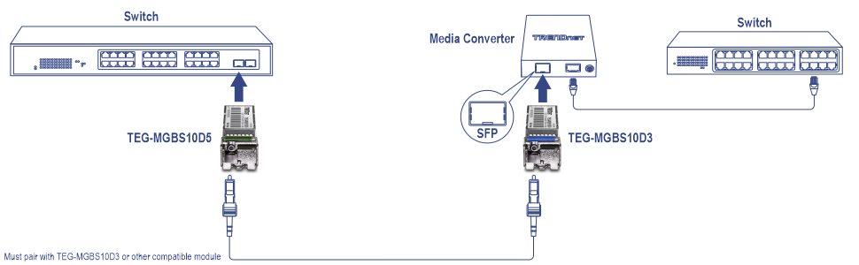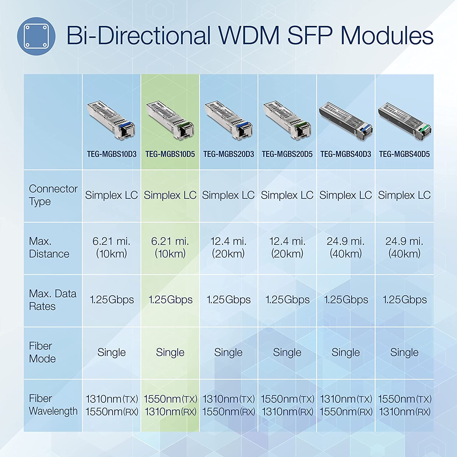 Transmit: 1550 nm / Receive: 1310 nm, pair with TEG-MGBS10D3 or compatible SFP module