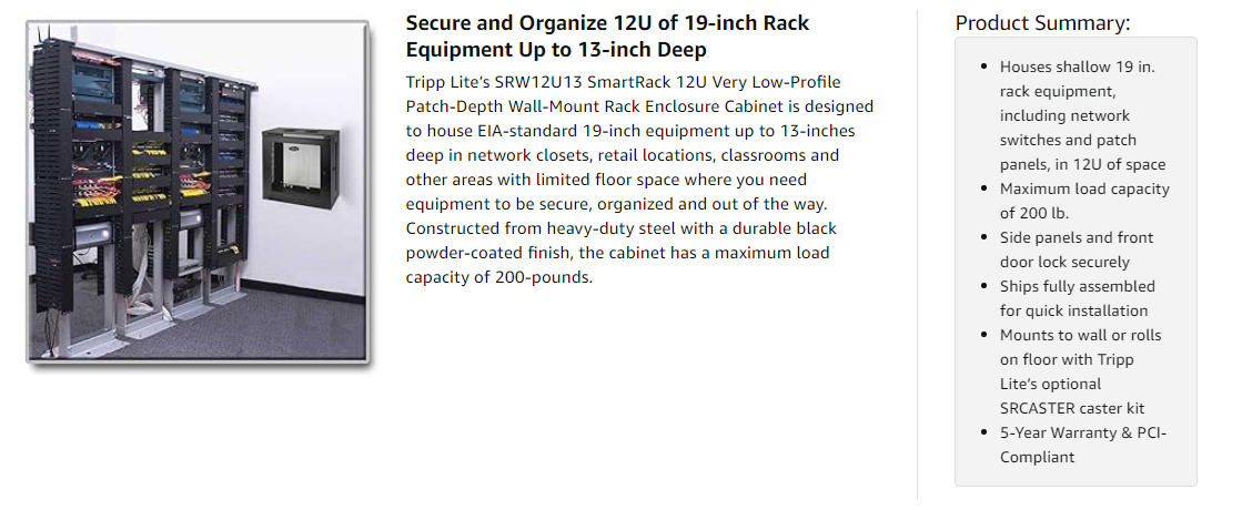 The SRW12U13 comes with a 5-year warranty. It’s manufactured in compliance with strict RoHS specifications, reflecting Tripp Lite’s commitment to environmental responsibility. The SRW12U13 provides physical equipment and media security required for PCI DSS (Payment Card Industry Data Security Standard) compliance.