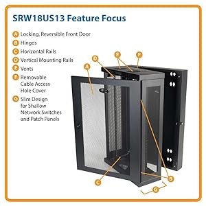 A locking, reversible front door and locking wall bracket restrict unwanted access to installed equipment while still allowing authorized personnel to perform inspections, maintenance and equipment replacement. The optional SRCASTER rolling caster kit (sold separately) adapts the SRW18US13 to floor-standing and roll-away applications under desks, tables or counters.