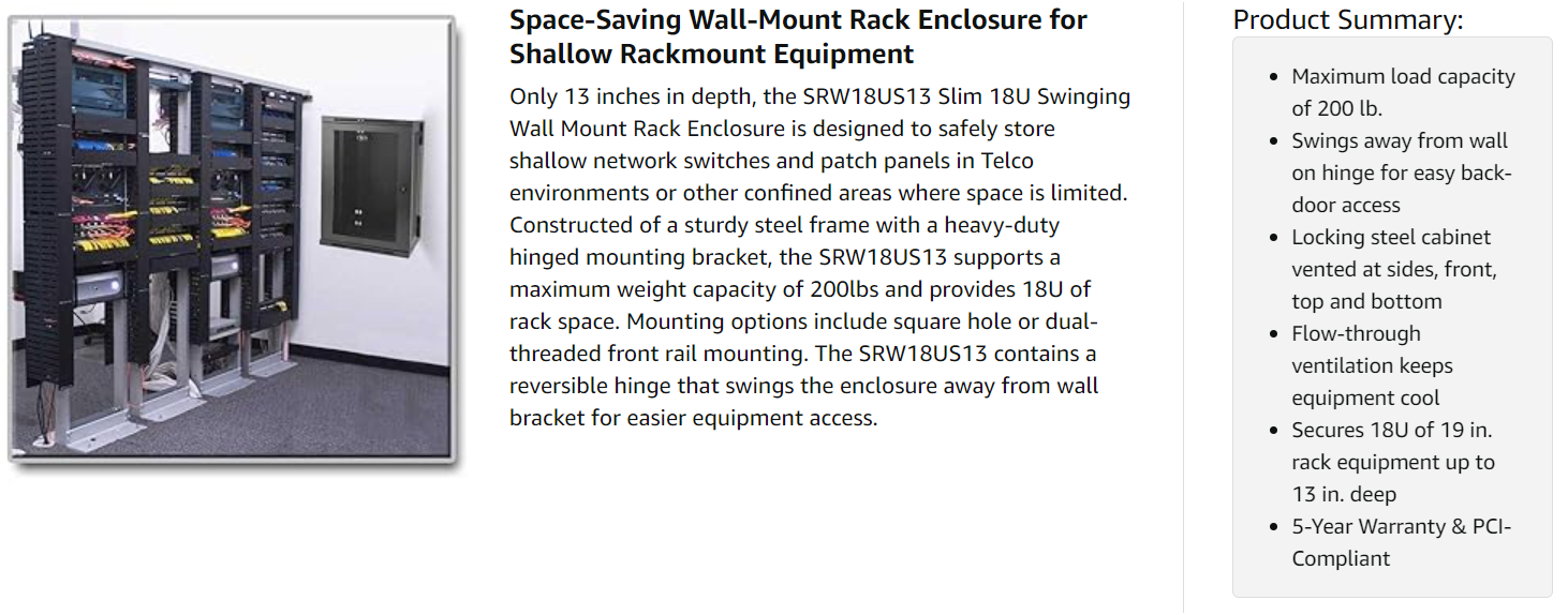 The SRW18US13 is manufactured in compliance with strict RoHS specifications, reflecting Tripp Lite’s commitment to environmental responsibility. For peace of mind, it comes backed by a 5-year warranty. The SRW18US13 is a safe, secure installation solution that meets all requirements toward PCI DSS (Payment Card Industry Data Security Standard) compliance.