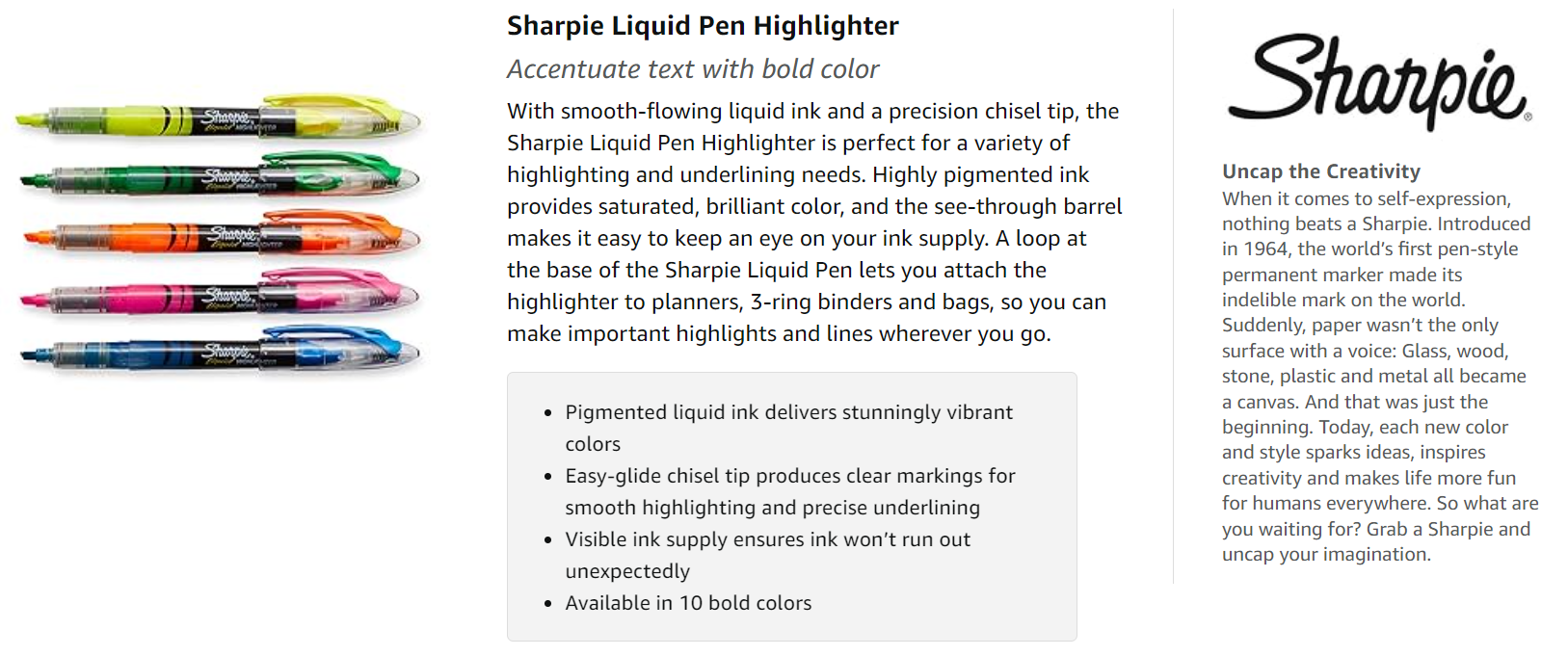 Highly pigmented ink allows you to make vibrant, eye-catching marks using the Sharpie Liquid Pen Highlighter. Mark up documents and emphasize important text with the versatile chisel tip, and carry your highlighters on the go with ease using the integrated loop, which attaches to binders, planners and bags.
