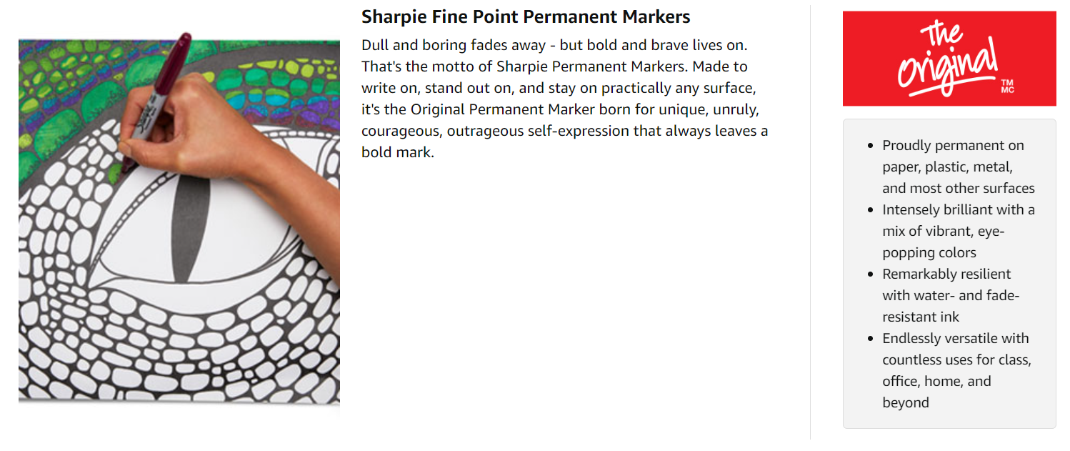 Proudly Permanent InkMade to mark and stand out on almost every surface, iconic Sharpie permanent ink is quick drying and water-and fade-resistant. |
