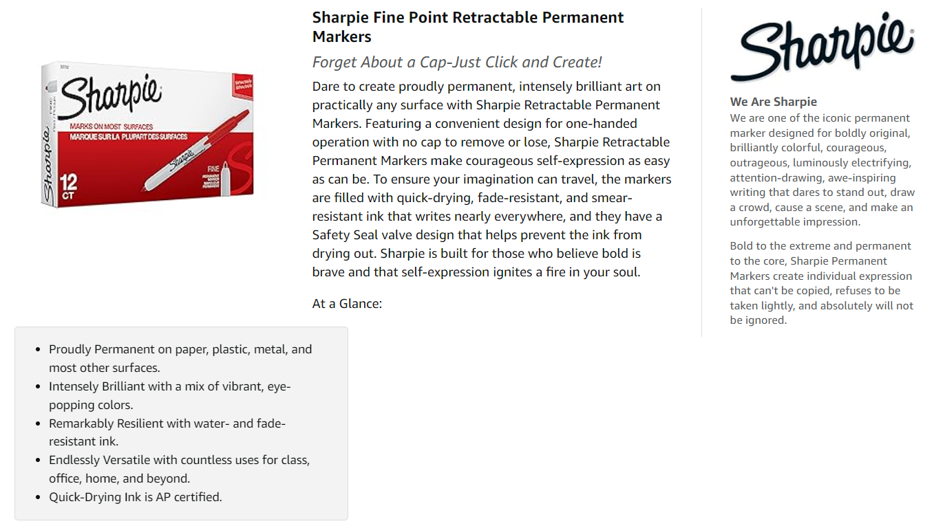 Proudly Permanent InkMade to mark and stand out on almost every surface, iconic Sharpie permanent ink is quick drying and water- and fade-resistant. |