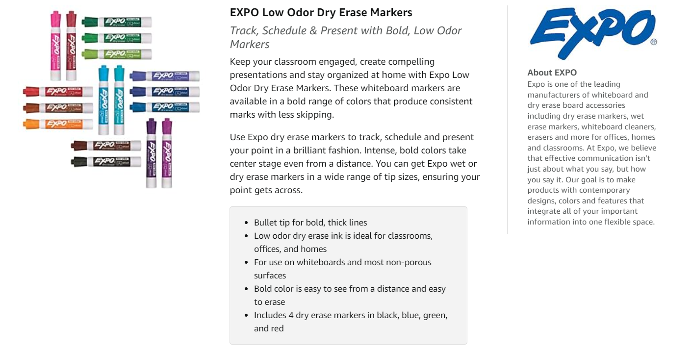 Trusted in OfficesFrom important client meetings to brainstorming and strategic planning sessions, you can count on reliable Expo dry erase markers. The #1 dry erase marker brand, the white board markers create consistent, easy-to-read lines and erase cleanly from most non-porous surfaces. |